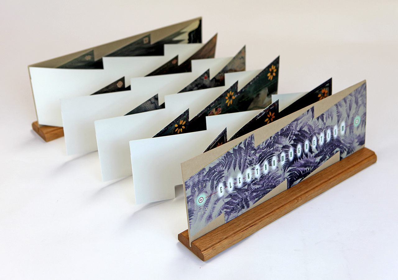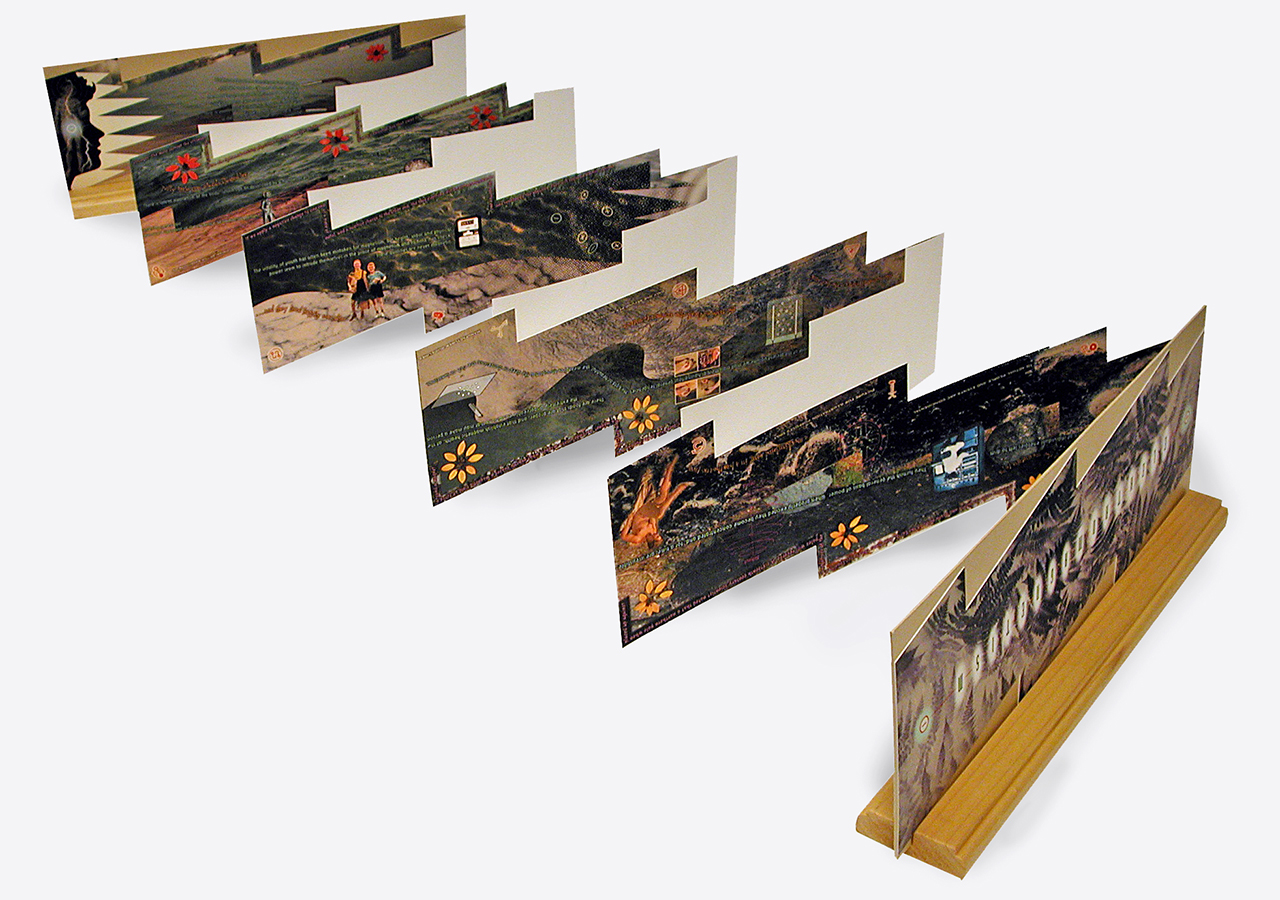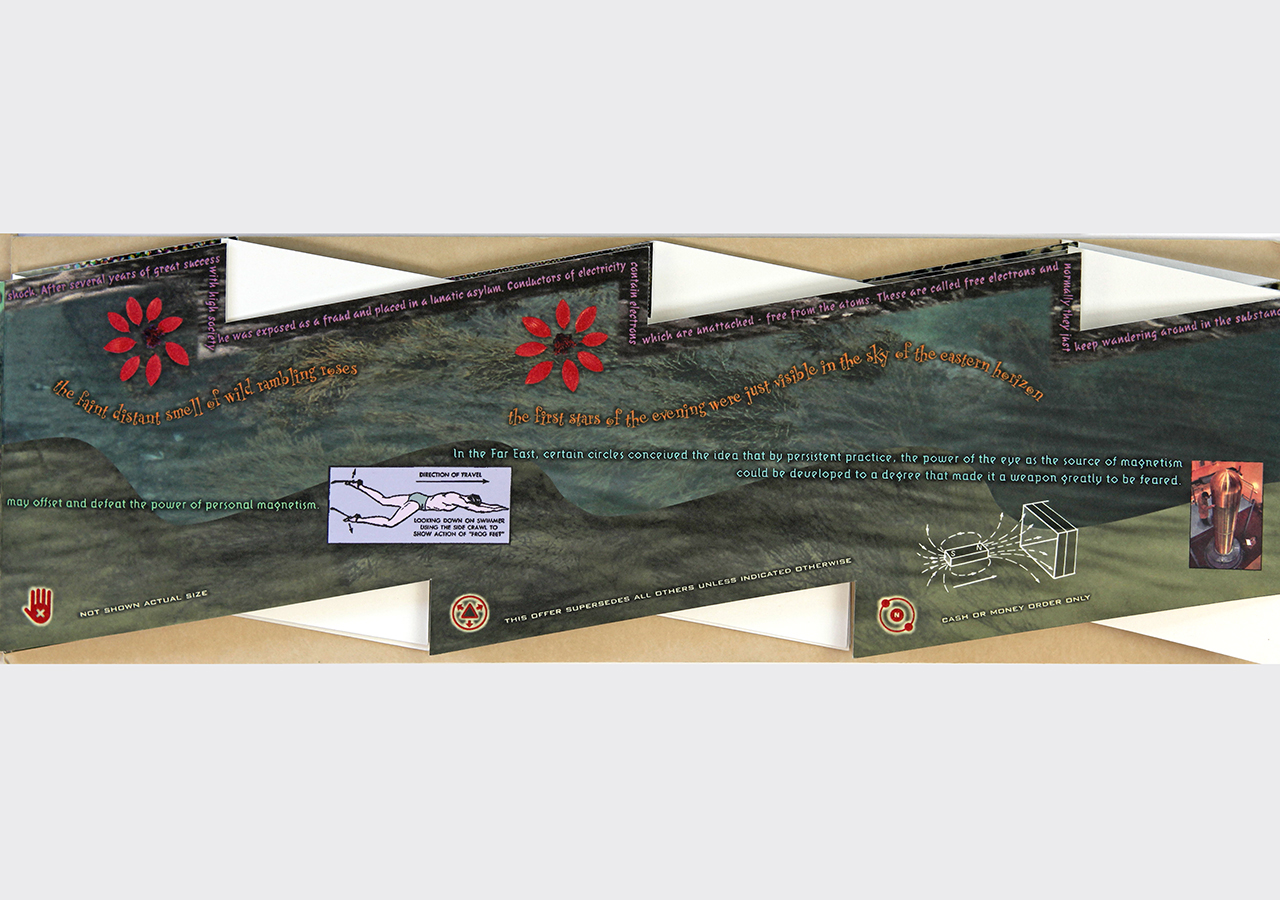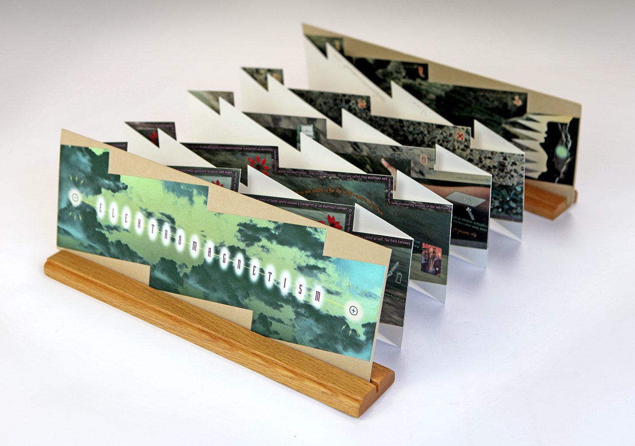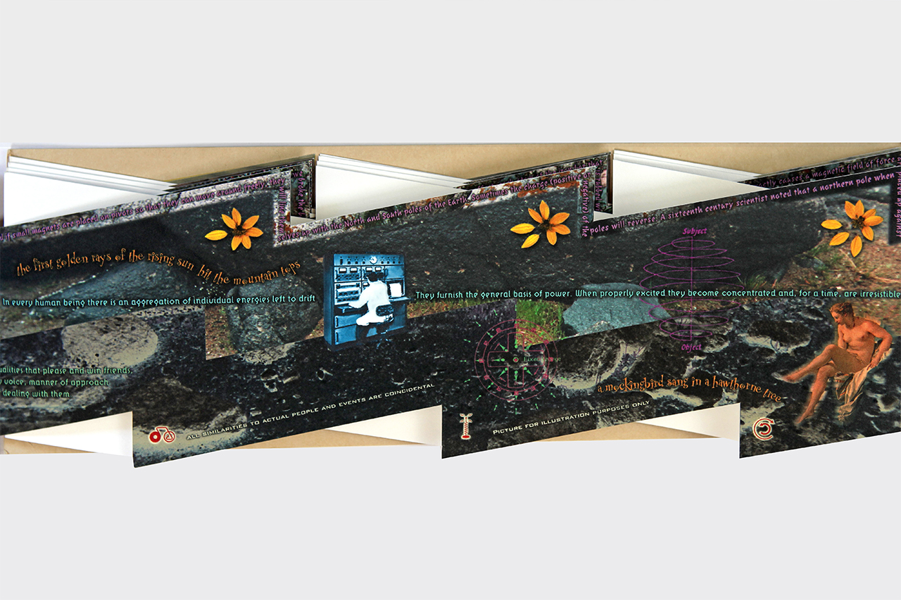 The resulting accordion book was shaped like a long electrical or lightning bolt. The dimensions closed are 5.5" x 16" x .25" but stretch out to ten feet when opened. The book was composed on a Macintosh Quadra 840av personal computer in Barrytown NY using Adobe Photoshop and Quark Xpress. It was digitally printed by IRIS printer by Cone Editions in East Topsam, Vermont, on Rives BFK and then coated with a UV protective substrate. I had originally planned on producing an edition of 100 but only about 20 were produced because of the extraordinary cost of the IRIS printing which was about $250 per book. IRIS has since gone out of business and there are no IRIS printers still functioning and no available spare parts available.