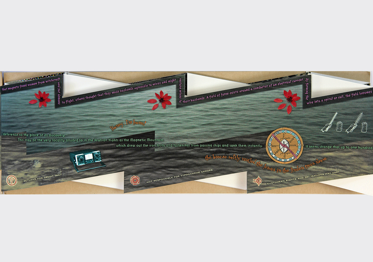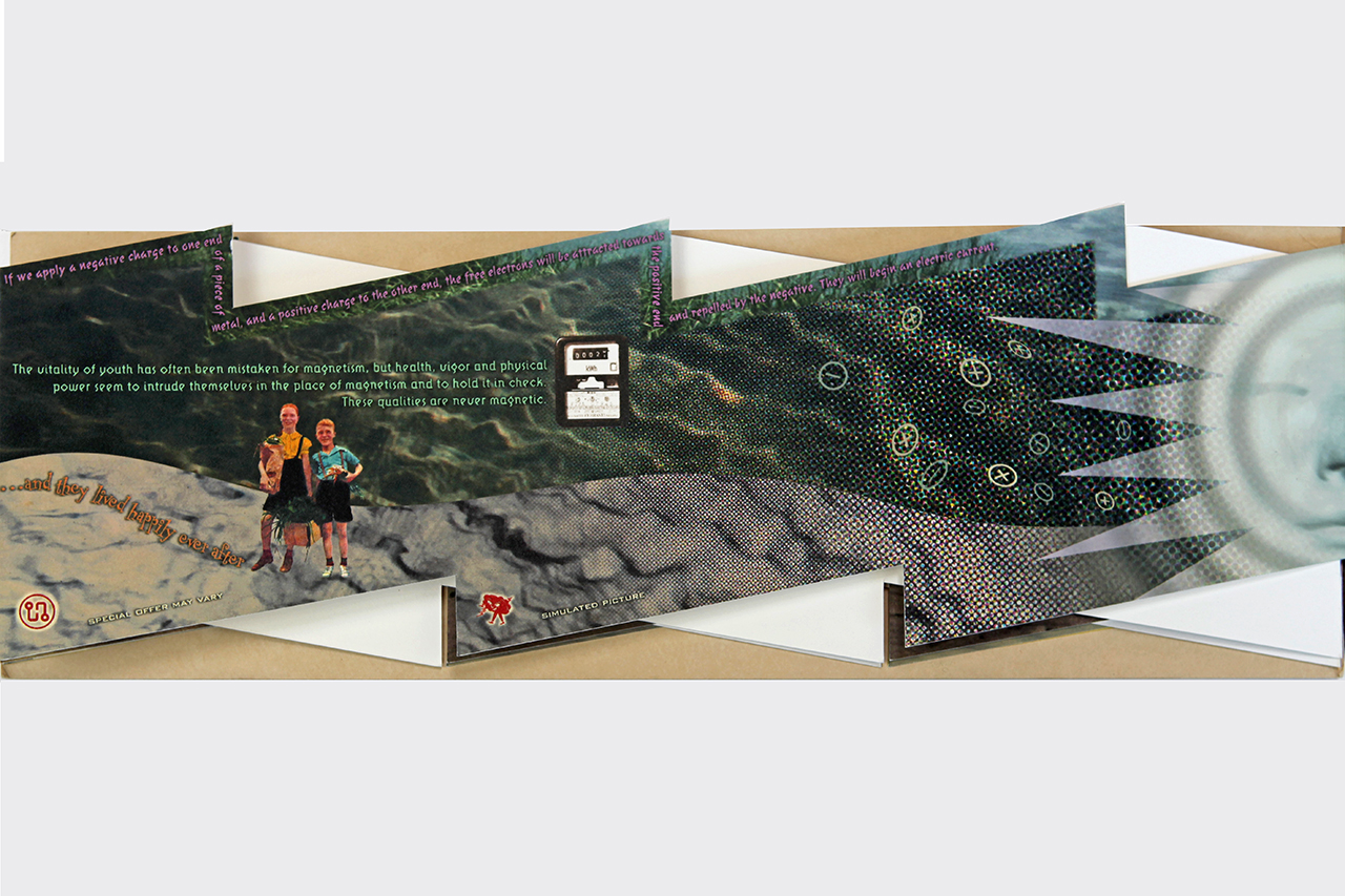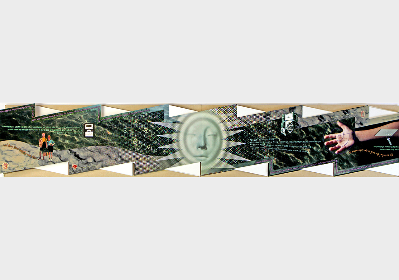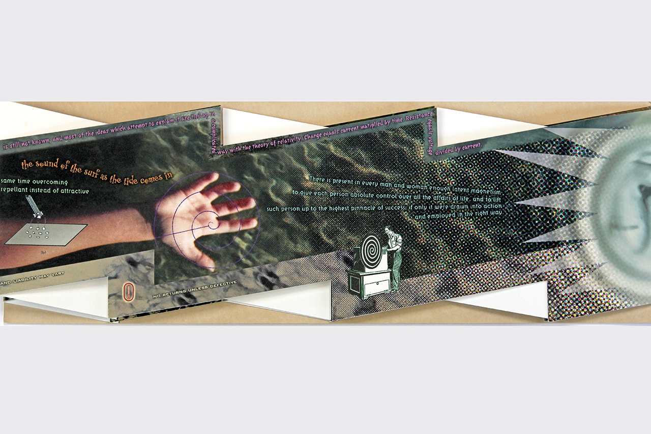 The resulting accordion book was shaped like a long electrical or lightning bolt. The dimensions closed are 5.5" x 16" x .25" but stretch out to ten feet when opened. The book was composed on a Macintosh Quadra 840av personal computer in Barrytown NY using Adobe Photoshop and Quark Xpress. It was digitally printed by IRIS printer by Cone Editions in East Topsam, Vermont, on Rives BFK and then coated with a UV protective substrate. I had originally planned on producing an edition of 100 but only about 20 were produced because of the extraordinary cost of the IRIS printing which was about $250 per book. IRIS has since gone out of business and there are no IRIS printers still functioning and no available spare parts available.