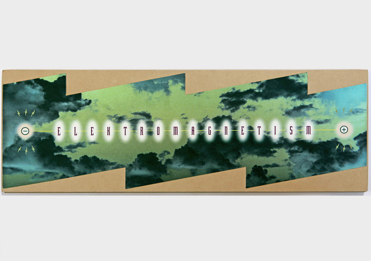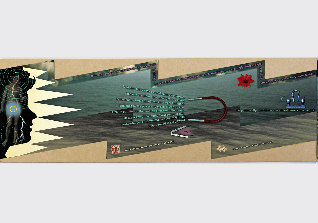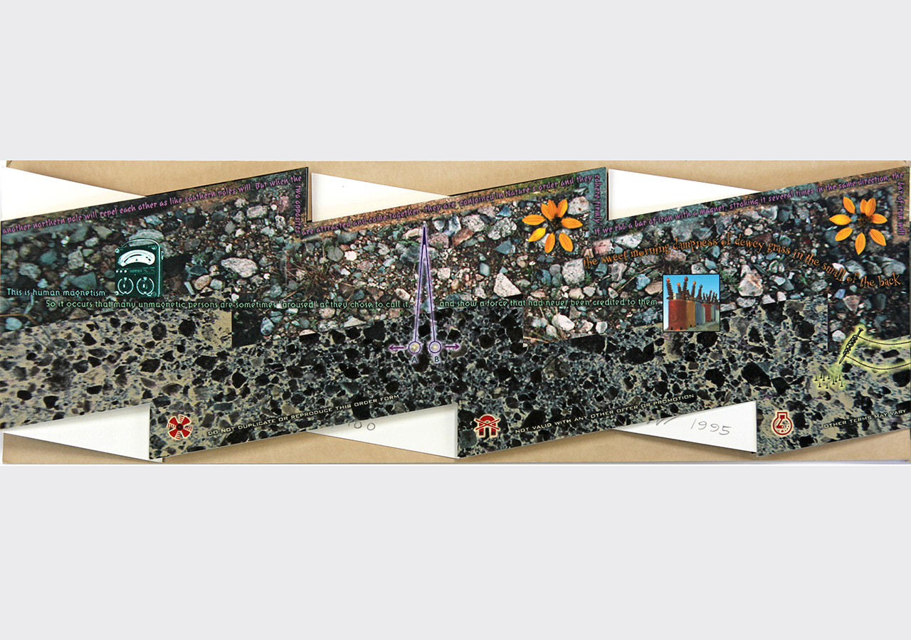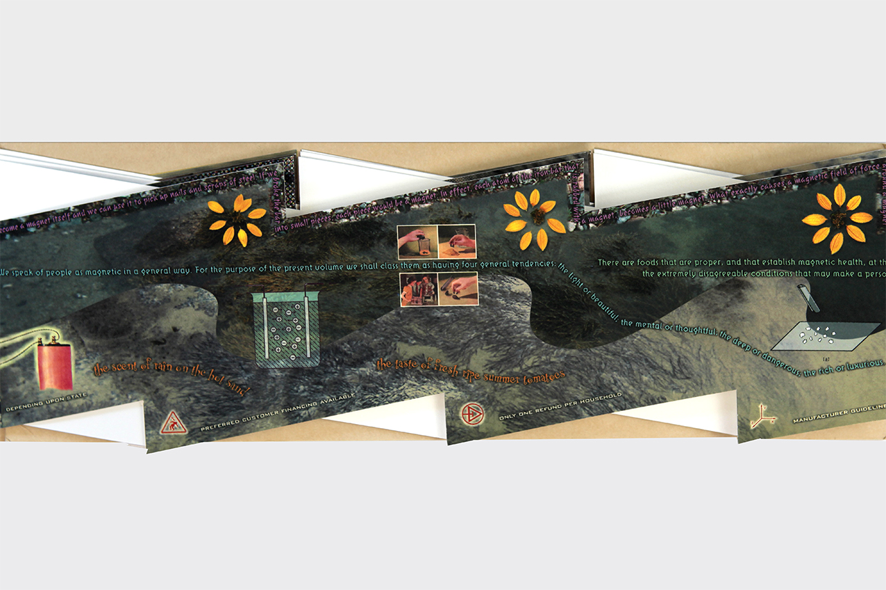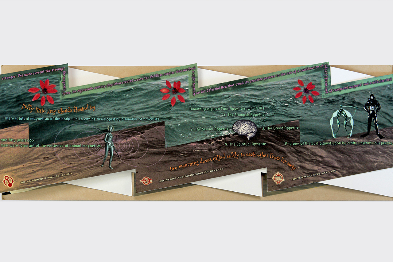 The resulting accordion book was shaped like a long electrical or lightning bolt. The dimensions closed are 5.5" x 16" x .25" but stretch out to ten feet when opened. The book was composed on a Macintosh Quadra 840av personal computer in Barrytown NY using Adobe Photoshop and Quark Xpress. It was digitally printed by IRIS printer by Cone Editions in East Topsam, Vermont, on Rives BFK and then coated with a UV protective substrate. I had originally planned on producing an edition of 100 but only about 20 were produced because of the extraordinary cost of the IRIS printing which was about $250 per book. IRIS has since gone out of business and there are no IRIS printers still functioning and no available spare parts available.