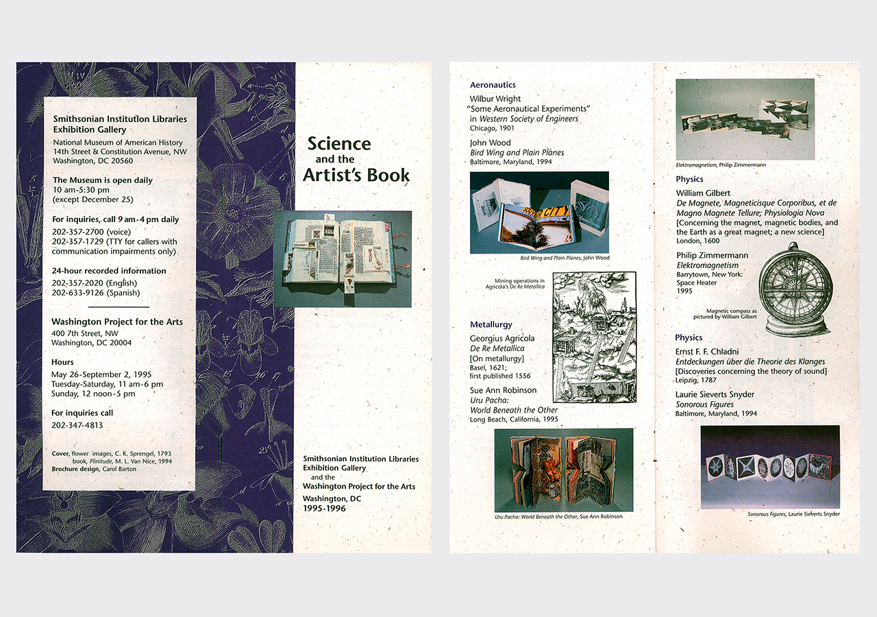 In 1994, a number of artists' book-makers, I think 27 or 28, were asked by artist-curator Carol Barton along with the head of the Smithsonian Libraries, to participate in a project that would end up as a show at the Smithsonian in 1995. The Smithsonian owned the famous Dibner Library of the History of Science and Technology. They asked the artists to pick one of the books and make an artists' book work that responded to the original scientific work. The Dibner Collection was quite incredible and included more than 200 original texts from such diverse people such as Descartes, Galileo, Da Vinci, Madame Curie and many more. If we could get to the Smithsonian, we could make an appointment to come and look and handle the original work, or we could use a hardbound book published by the Smithsonian called Heralds of Science that had every work listed and illustrated. They sent each of us a copy. The new work could be a unique book or an editioned piece.