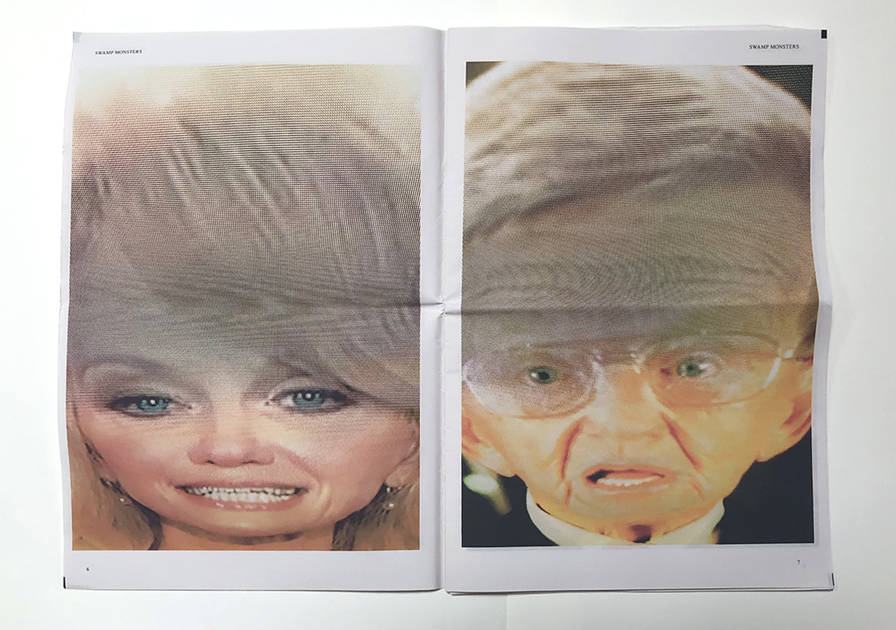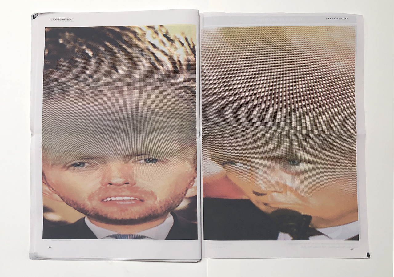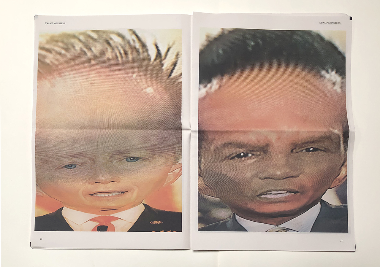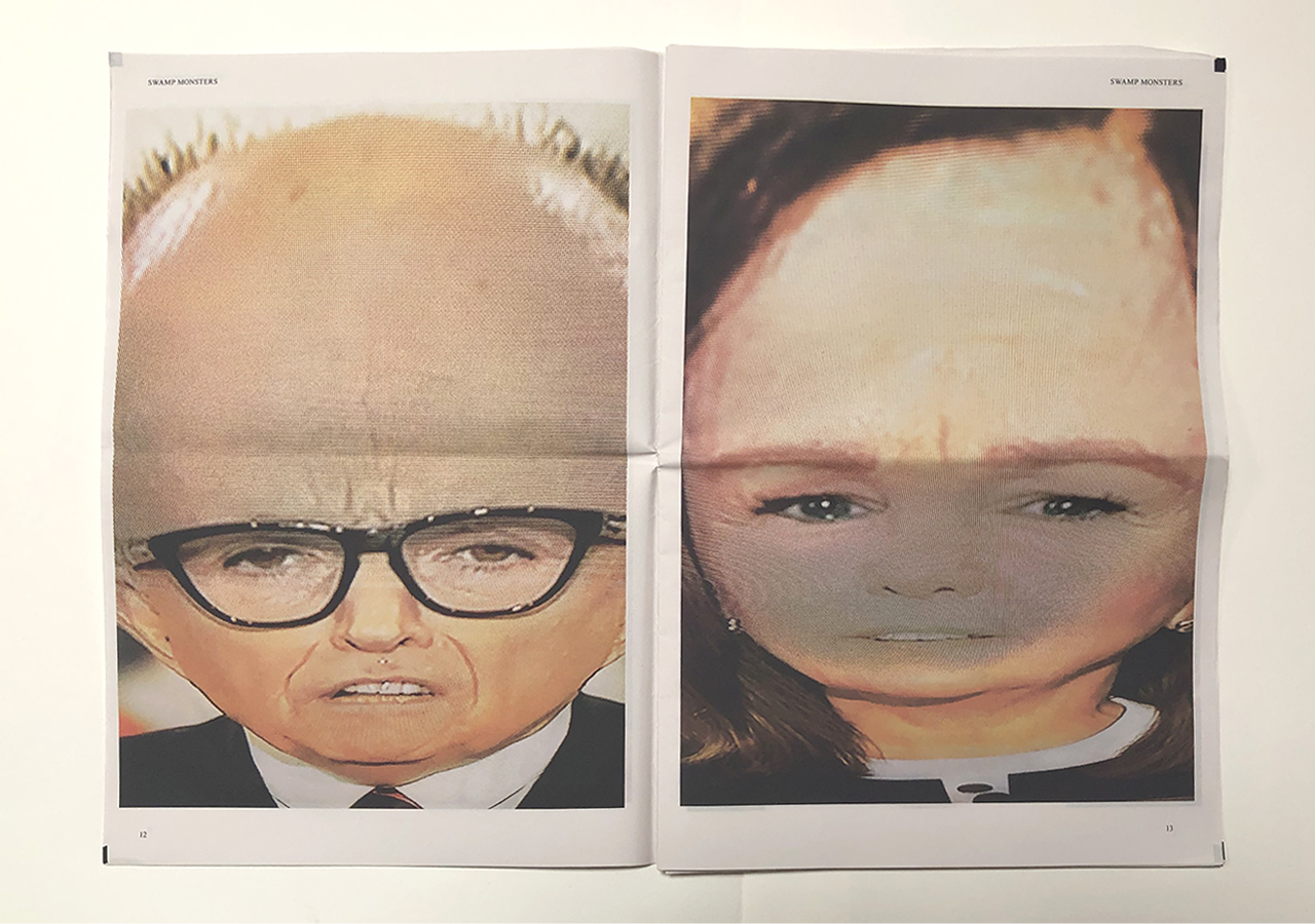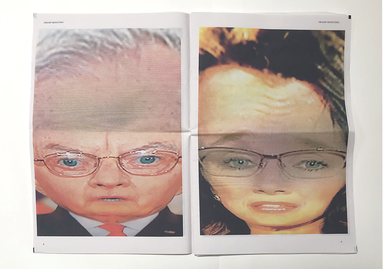 The Ice Plant (Los Angeles) and Spaceheater Editions (Tucson) announced the co-publication of Swamp Monsters on September 21, 2020, just three and a half weeks after these photographs from the 2020 Republican National Convention were taken. Swamp Monsters is a limited newsprint edition of 666 copies and commemorates the historically frightful 2020 Republican National Convention (August 24-27, 2020) with a series of photographs made by Philip Zimmermann as the spectacle unfolded on the television screen. This rogue's gallery of hideous video portraits was printed in Paris, France by printnewspaper.com in full color in an unbound tabloid newspaper format. Many thanks to Clif Meador of the Studio of Exhaustion for suggesting the title.