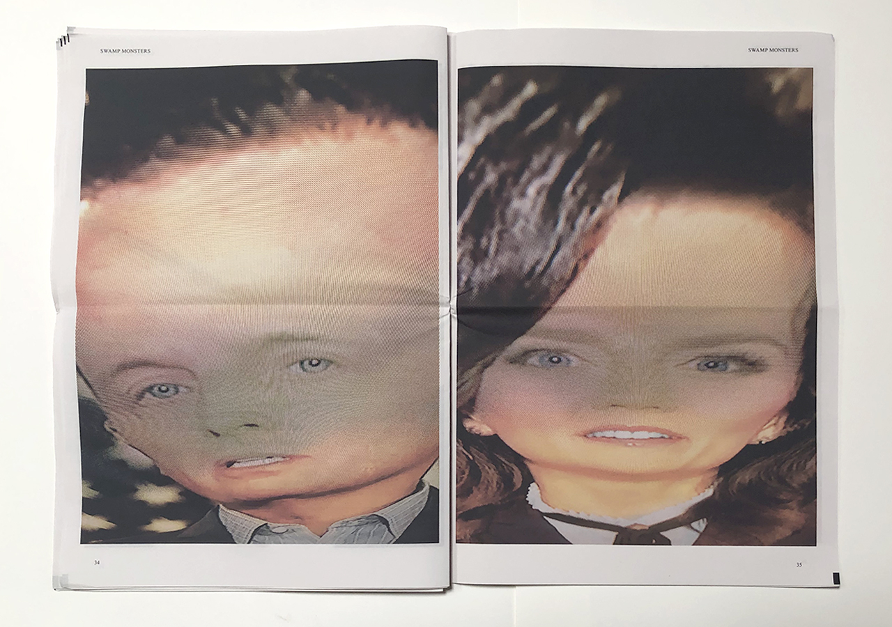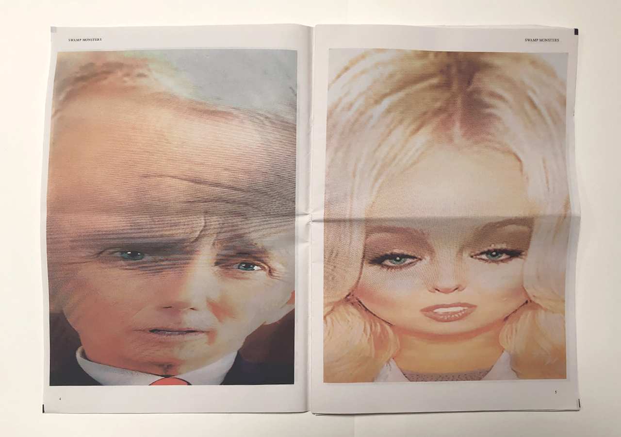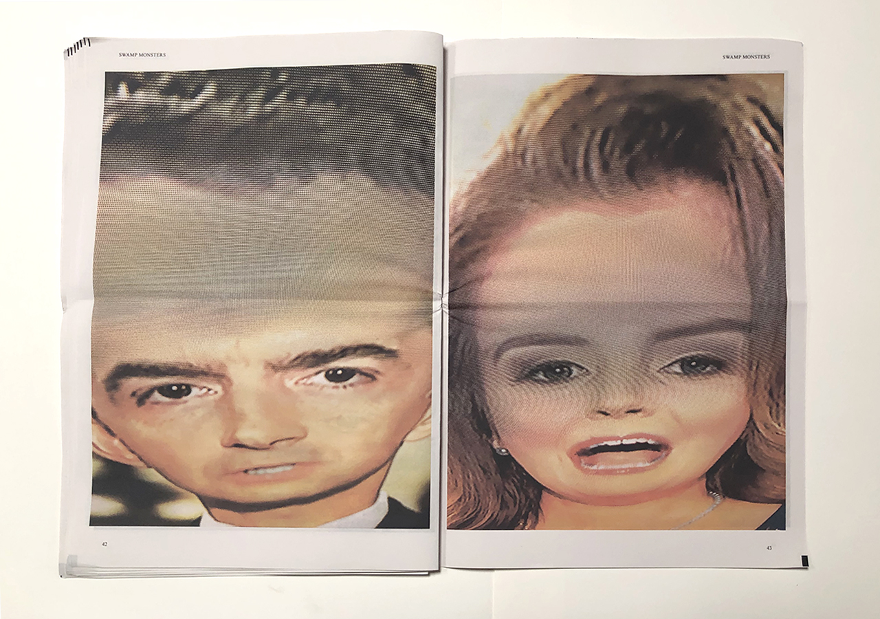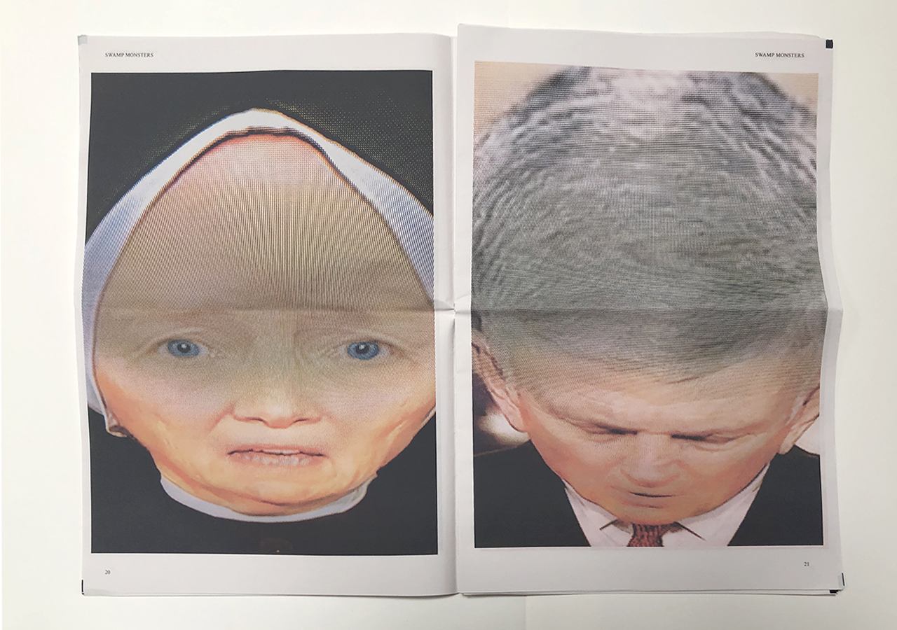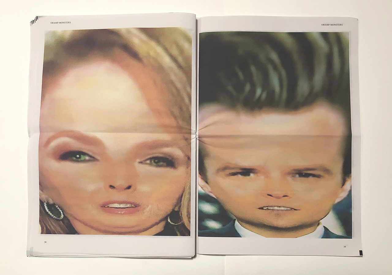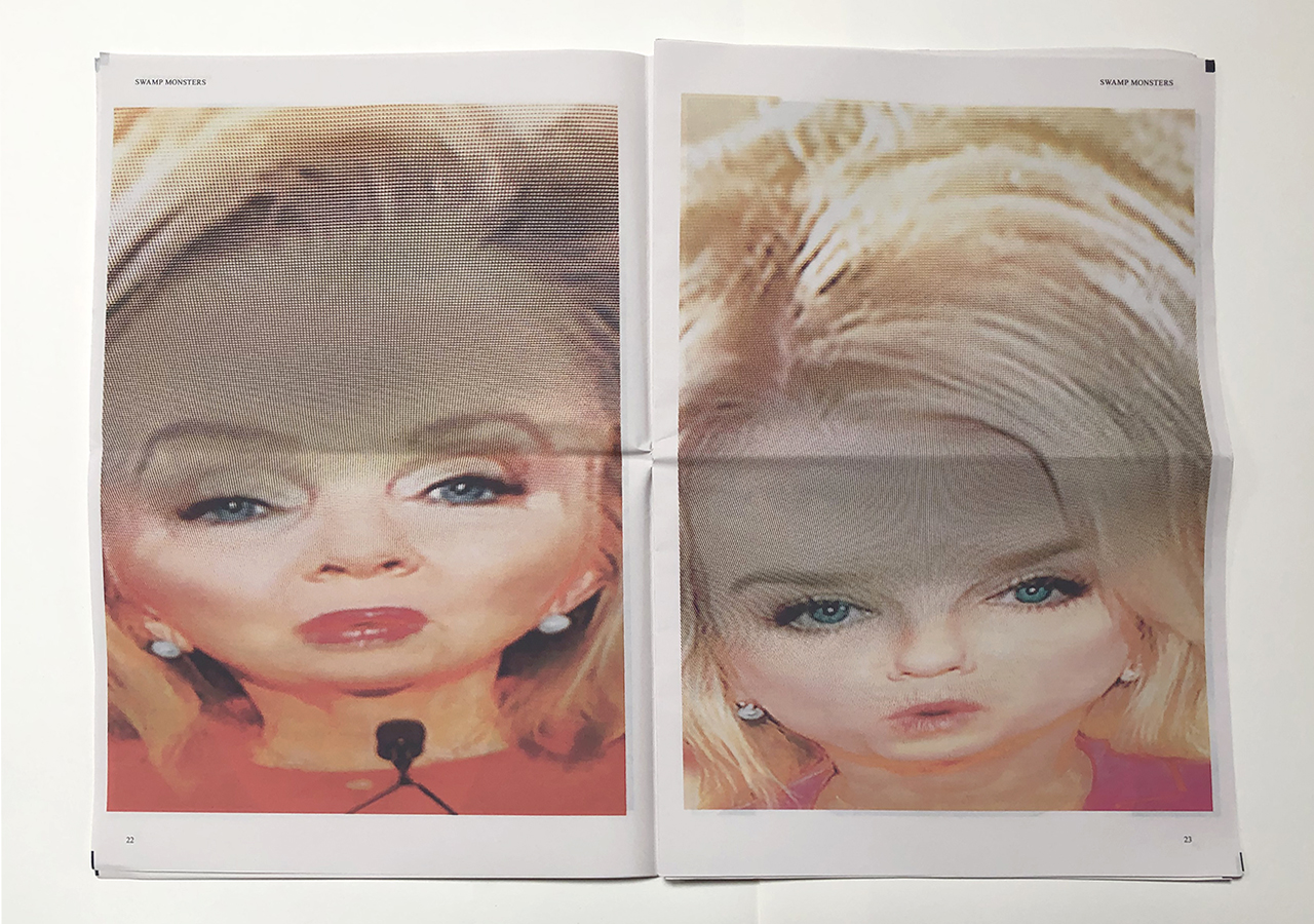 The Ice Plant (Los Angeles) and Spaceheater Editions (Tucson) announced the co-publication of Swamp Monsters on September 21, 2020, just three and a half weeks after these photographs from the 2020 Republican National Convention were taken. Swamp Monsters is a limited newsprint edition of 666 copies and commemorates the historically frightful 2020 Republican National Convention (August 24-27, 2020) with a series of photographs made by Philip Zimmermann as the spectacle unfolded on the television screen. This rogue's gallery of hideous video portraits was printed in Paris, France by printnewspaper.com in full color in an unbound tabloid newspaper format. Many thanks to Clif Meador of the Studio of Exhaustion for suggesting the title.
